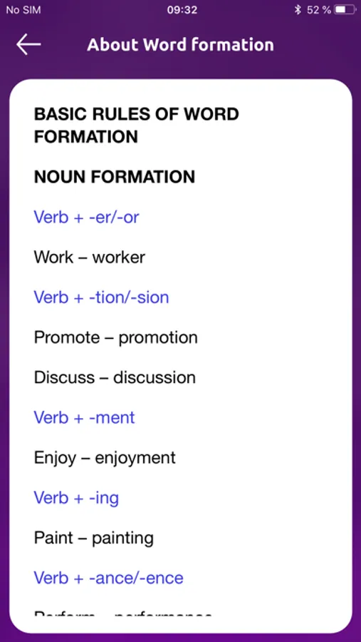 Here you will NOT find endless lists of suffixes, prefixes, rules and exceptions as well as the words that are hardly ever used. We do believe that the best way to master your word formation skills is practice. So we tried to develop this app in a way that will help you memorize the main word building rules automatically.