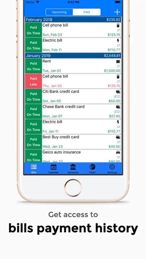 - Different views: Upcoming Bills, Paid Bills, Accounts, Account Bills, Calendar View, Chart View, Settings, etc.