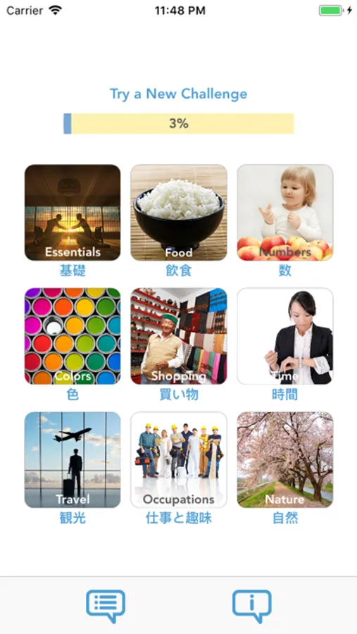 The course is made of 10 lessons (topics), each of them helping to grasp new words, expressions and grammar usable in daily live, overseas trips and classroom environments for all generations of beginner level learners. You can see all the topics on the first page of the app. The app teaches you around 315 new words and expressions.