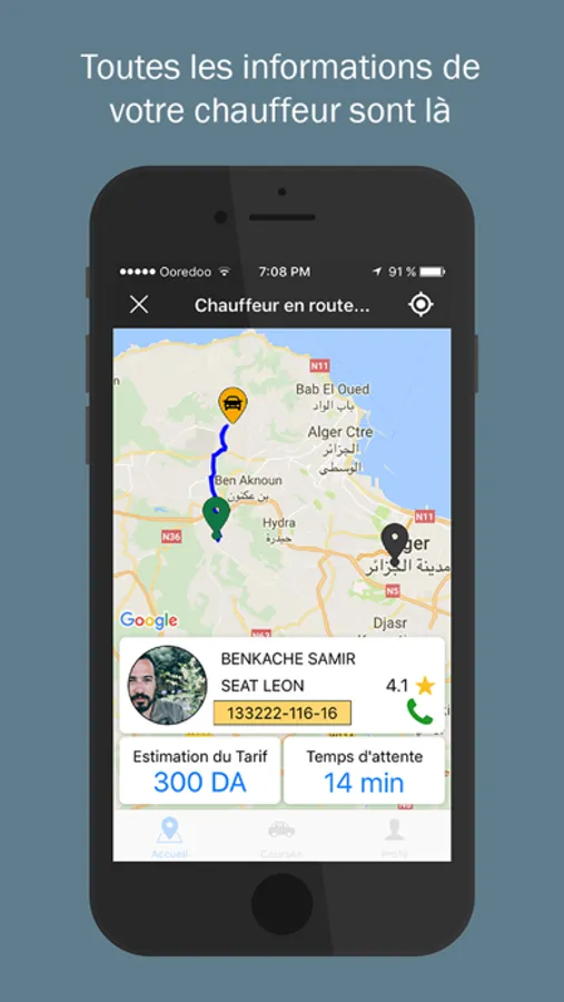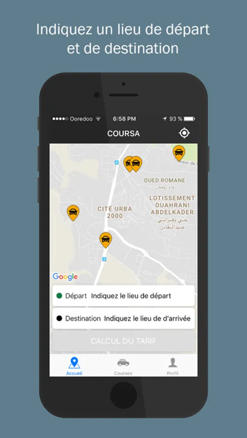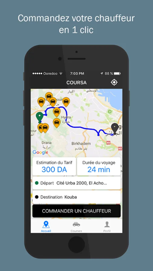 COURSA est une application qui vous permet de commander un chauffeur privé 24h/24 et 7j/7 à Alger, Oran et bientôt d'autres wilayas.