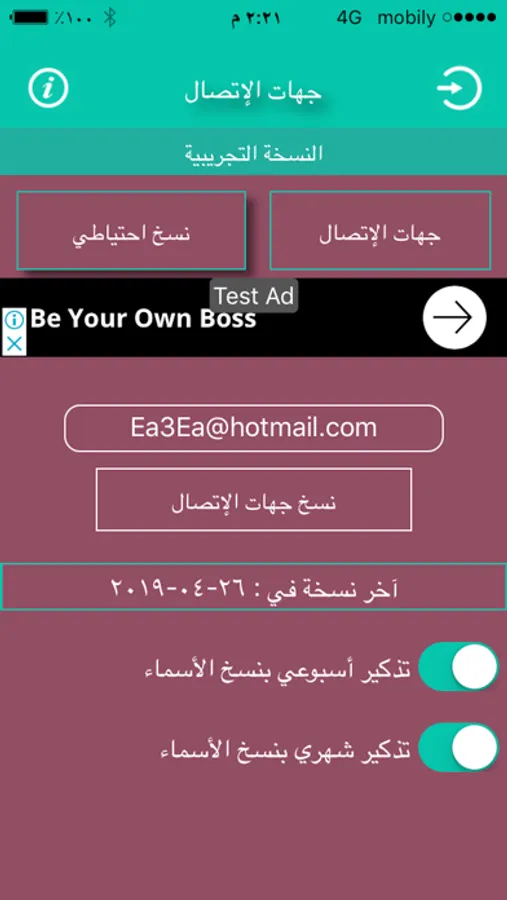 نسخ أحتياطي للأسماء إلى بريدك الإلكتروني دون الحاجة لإستخدام الكمبيوتر ويمكنك أن تجعل التطبيق يقوم بتذكيرك لنسخ الأسماء أسبوعياً أو شهرياً