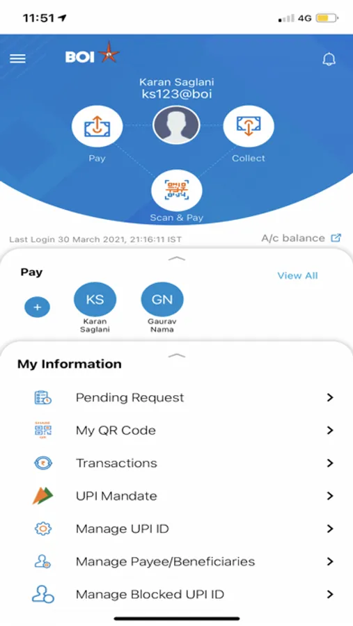 Bank of India offers UPI application for the customers of BOI as well of other banks to register in the app and link their accounts. Customer shall be able to Pay and initiated collect money requests to their contacts.