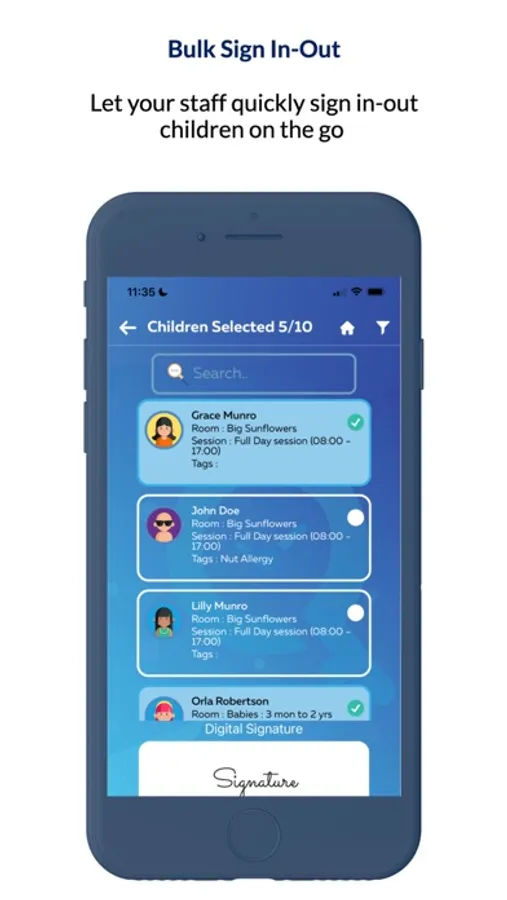 Quickly and easily sign in-out children - filter by name, tags and capture digital signatures for real-time attendance tracking.