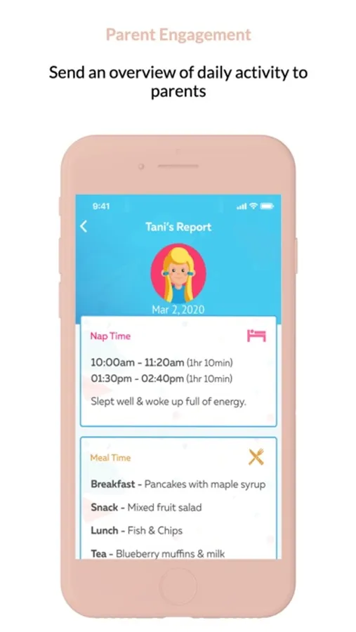 Save time with digital auto-fill meal menu planners, send reminders, post play, naps and mood activity to parent’s timeline and much more!