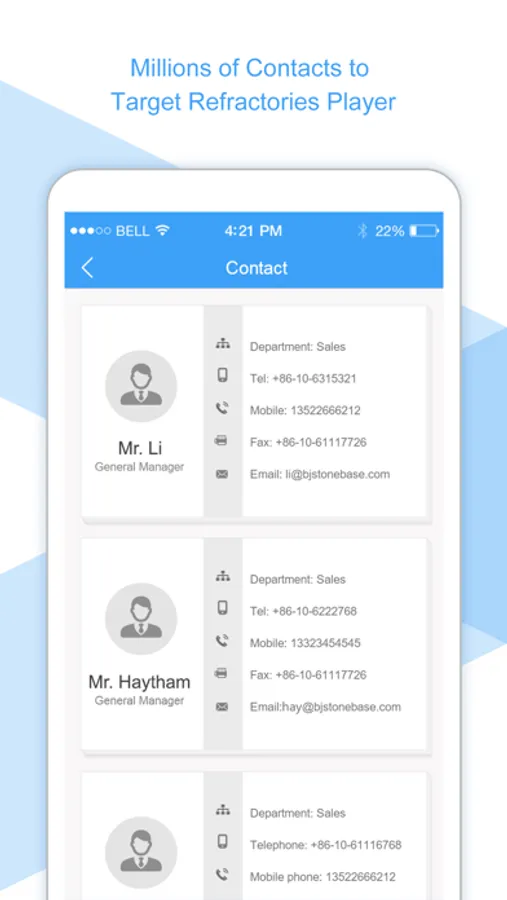 * Updated contacts of manager of supply, sales and technical departments in target suppliers or potential buyers;