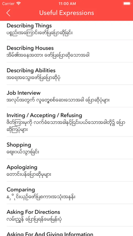 - Each expression in English and Myanmar with meanings