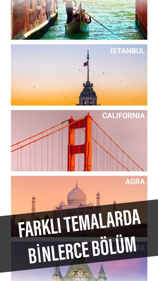 Yeni Kelime ve Sözcük Bulmaca Oyununuz! Kelime Arama ve Sözcük Bulmaca oyunlarını seviyorsanız ve yaratıcı bir kelime bulmaca oyunu arıyorsanız bu oyun tam size göre! Kelimelerin dünyasında bir geziye çıkmaya var mısınız? Kelime Gezmece ile hem kelime bilginizi geliştirerek beyin jimnastiği yapın hem de eşsiz yöresel müzikler eşliğinde birbirinden güzel şehir manzaralarının tadını çıkarın!