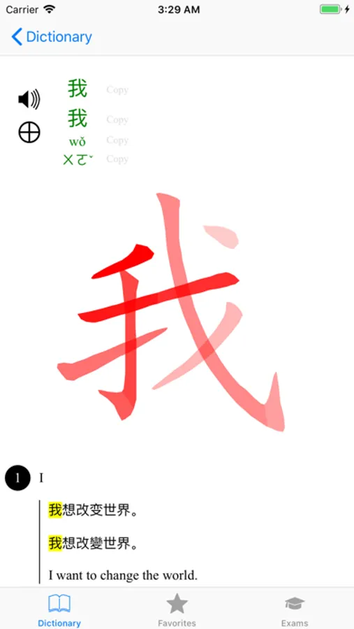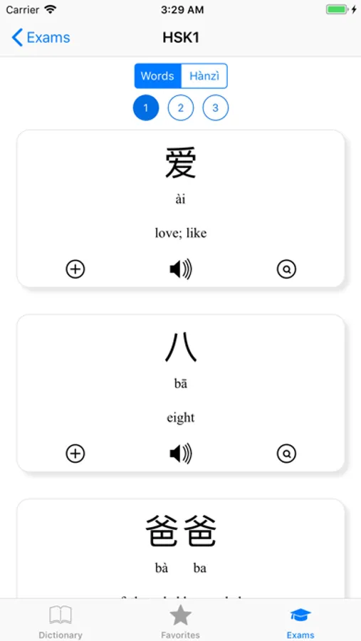 Chinese dictionary flash cards may contain audio pronunciation, stroke animations, measure words (classifiers) and example sentences.