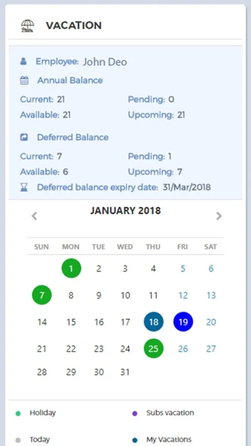 Vacation module used by admins and employees to track how many vacation days they have earned to date.