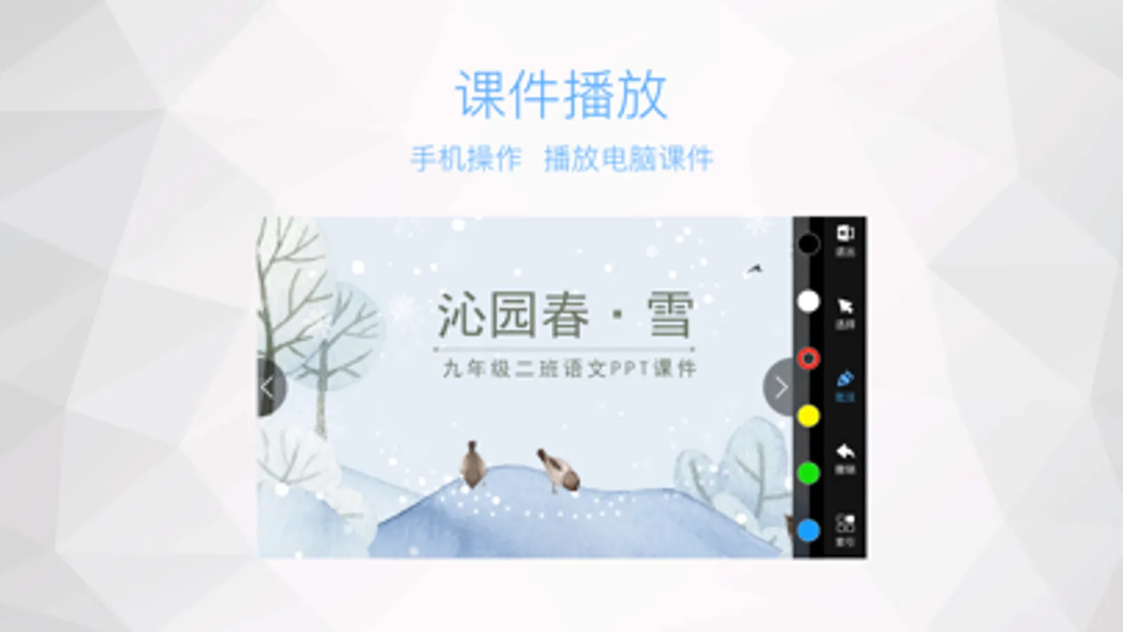 播放课件:手机可以对电脑已经打开的PPT或鸿合白板课件进行播放控制和批注、撤销等操作。