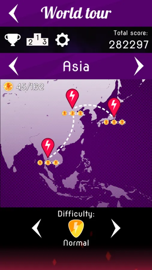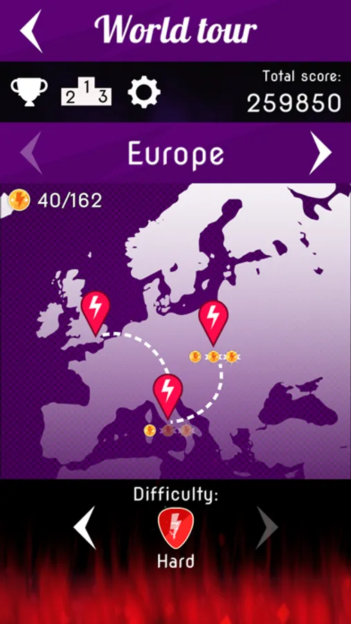You start your career in Europe. If you are good enough you will try to play in other continents. Unclock all levels and play the final concert in the USA. Turn yourself into a music superstar!