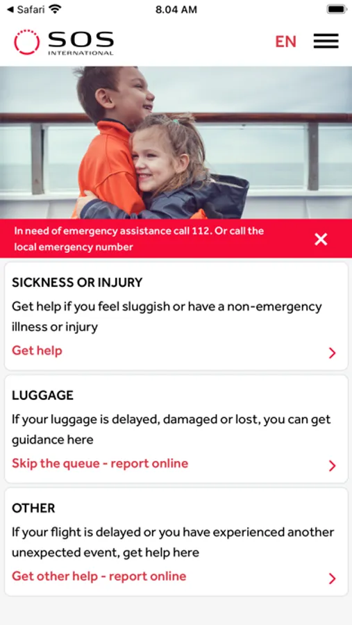 Assistance requests submitted via this app must be non-acute and could relate to sickness or injury, luggage, flight delay, and/or direction to nearest and most appropriate local treatment facility.