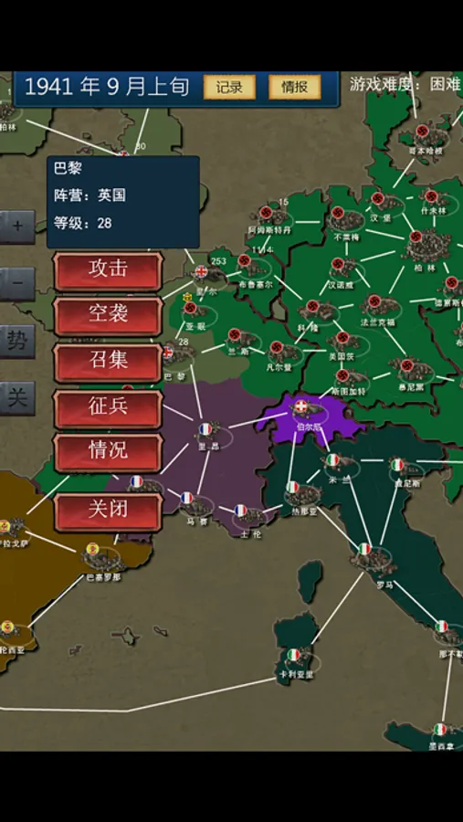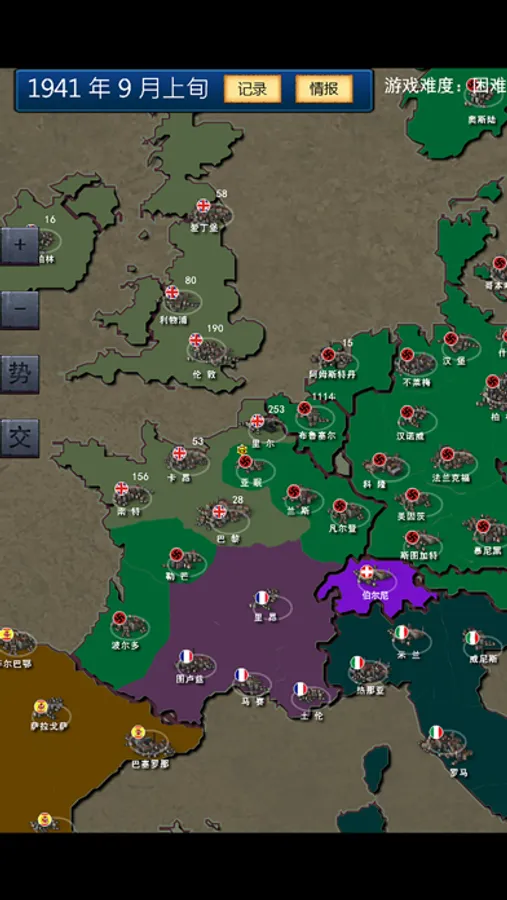 模拟二战的战略游戏,竖屏设计,适合单手游戏,游戏以整个欧洲为地图,玩家可以扮演英国、德国、苏联等二战势力。带领这些势力取得胜利。
