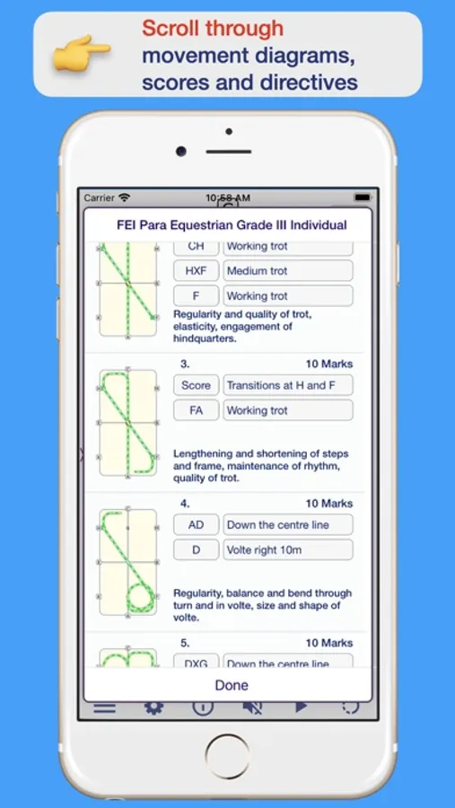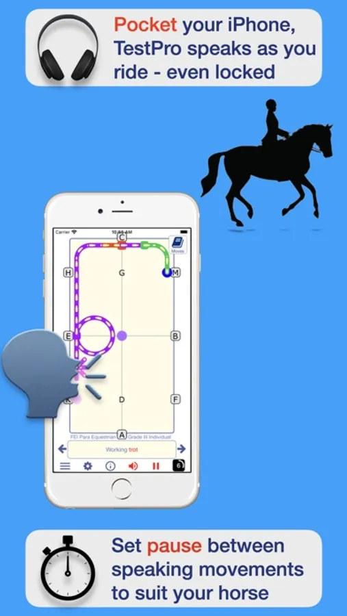 - Bluetooth to a headset or speaker and ride to the test, change pauses to suit your horse