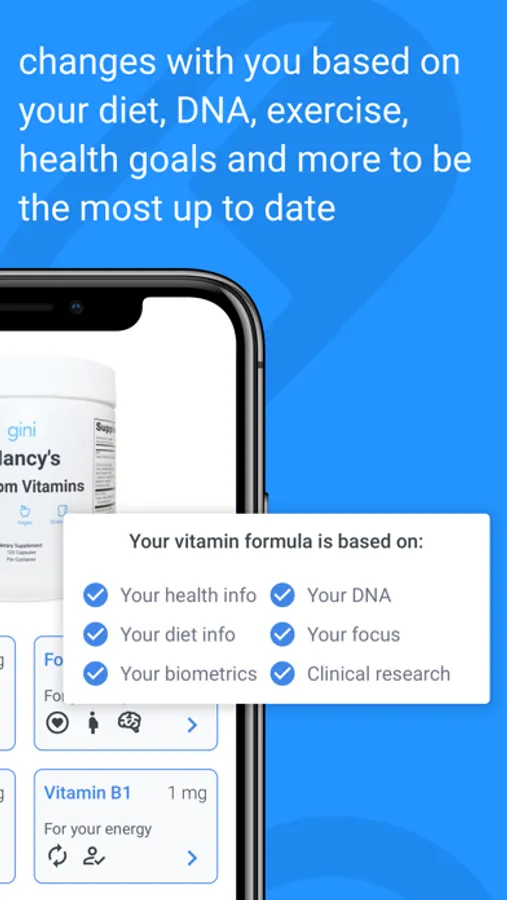 Your nutrition and multivitamin needs should be personalized for your genetics, lifestyle, diet, and health goals! Gini health helps you find the best balance between your diet and your supplementation. The app calculates your exact multivitamin dosages based on your DNA, diet, exercise, sleep, location & health goals. We create a smart multivitamin pill and deliver it to your doorstep every 2 months. You also get over 50+ health reports for free when you connect your existing DNA data!