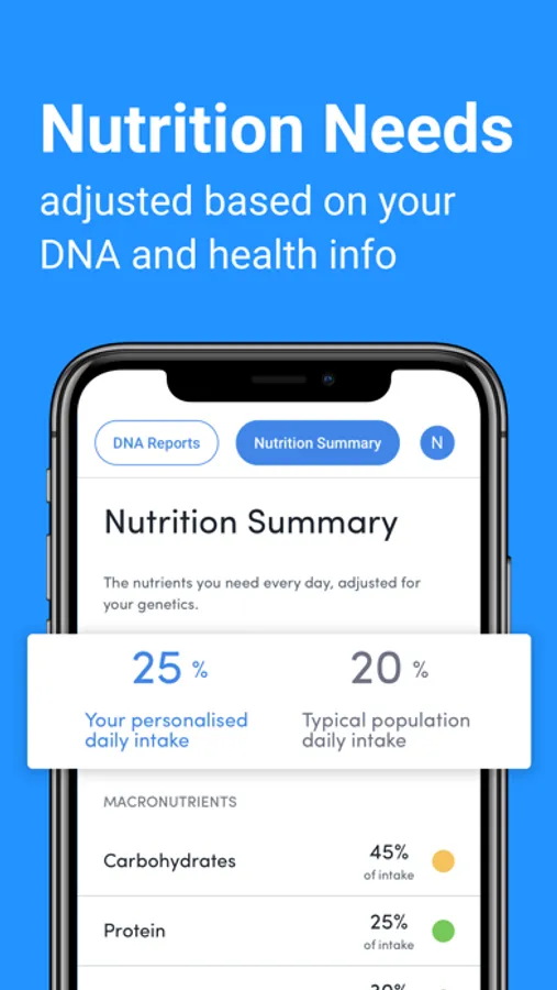 Unique to Gini, you can get your own personalized DNA based nutritional summary. View your gene adjusted values for macros and micro-nutrients, and see recommended daily intake for the average user.