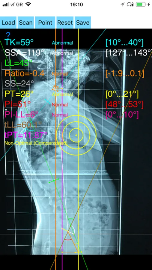 -By marking several points at the image of X-ray, the App calculates and offers a very convenient way to determine the most accurate possibly way at once, Pelvic incidence (PI), Sacral slope (SS), Pelvic Tilt (PT), Lumbar lordosis (LL), thoracic kyphosis, C7 plumb line (C7PL), C7PLD/sfd ratio, PI–LL, theoretical normal pelvic tilt (tPT),theoretical normal L1-S1 lumbar lordosis (tL1S1), Spino-sacral angle (SSA) According to measured parameters the app categorizes the severity of the imbalance of spine, in three different stages: optimal balanced, balanced with compensatory mechanisms and imbalanced.