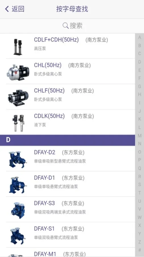 1. 通过行业,类型,字母查找国内主流泵型信息;