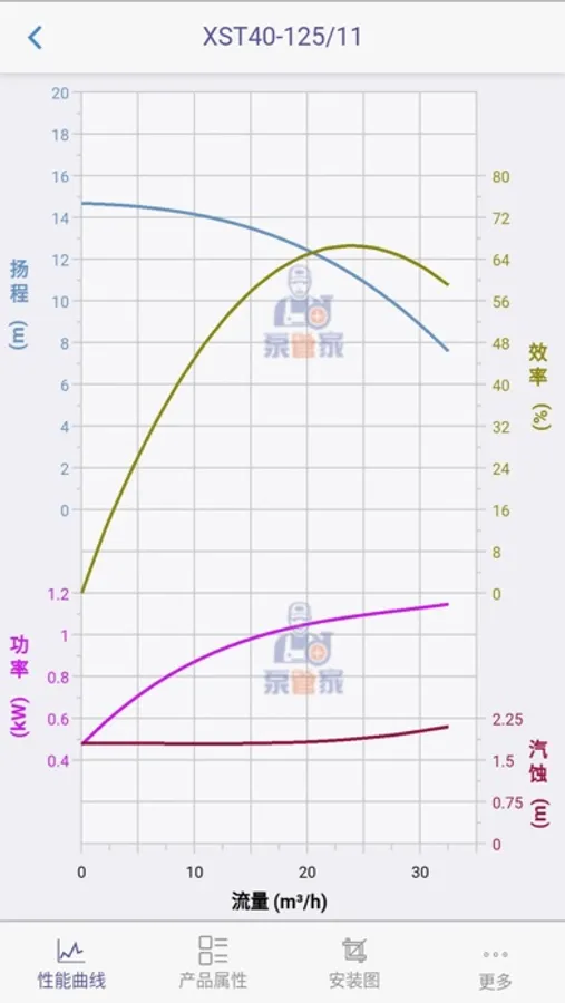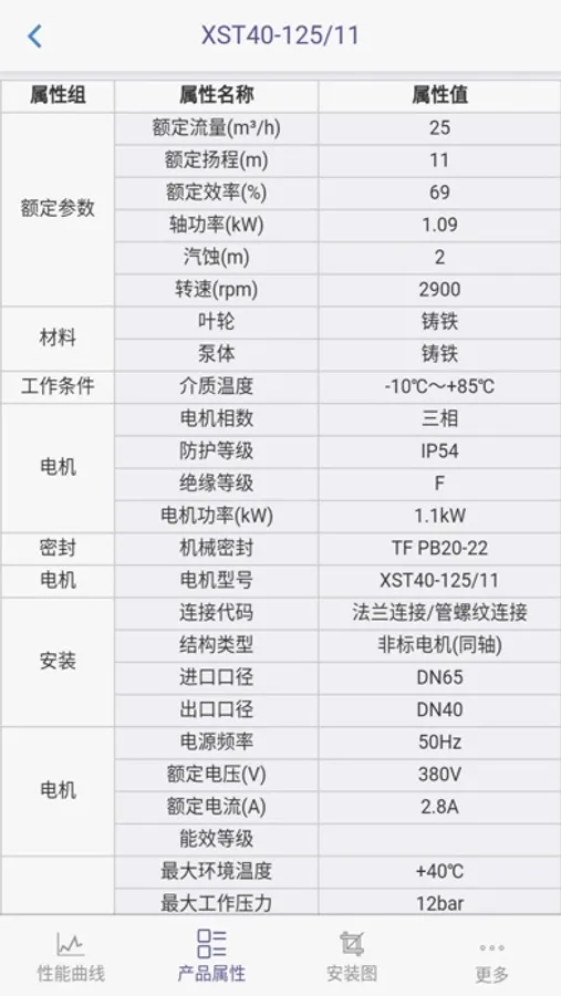 3.查看泵的性能曲线图,安装图,结构图,产品属性,三维模型等;