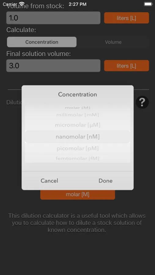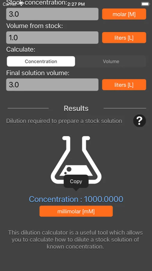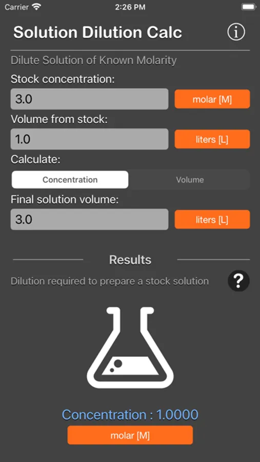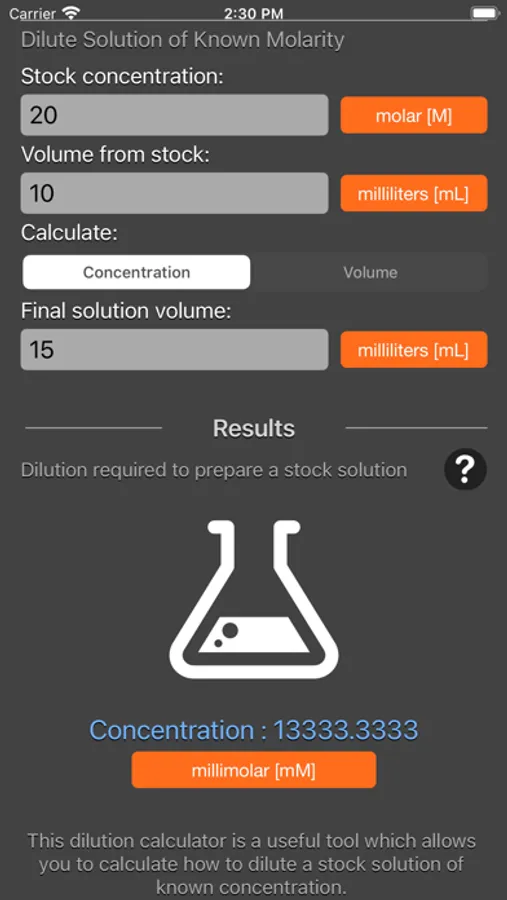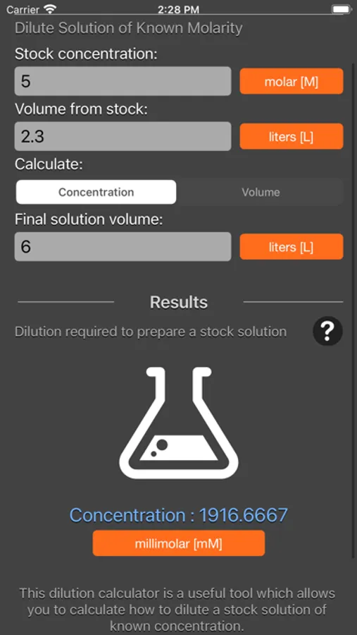 The solution dilution calculator calculates the volume of stock concentrate to add to achieve a specified volume and concentration. The calculator uses the formula C1V1 = C2V2 where "1" represents the concentrated conditions (i.e. stock solution Molarity and volume) and "2" represents the diluted conditions (i.e. desired volume and Molarity).