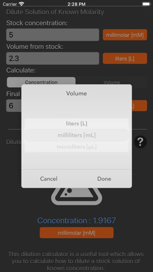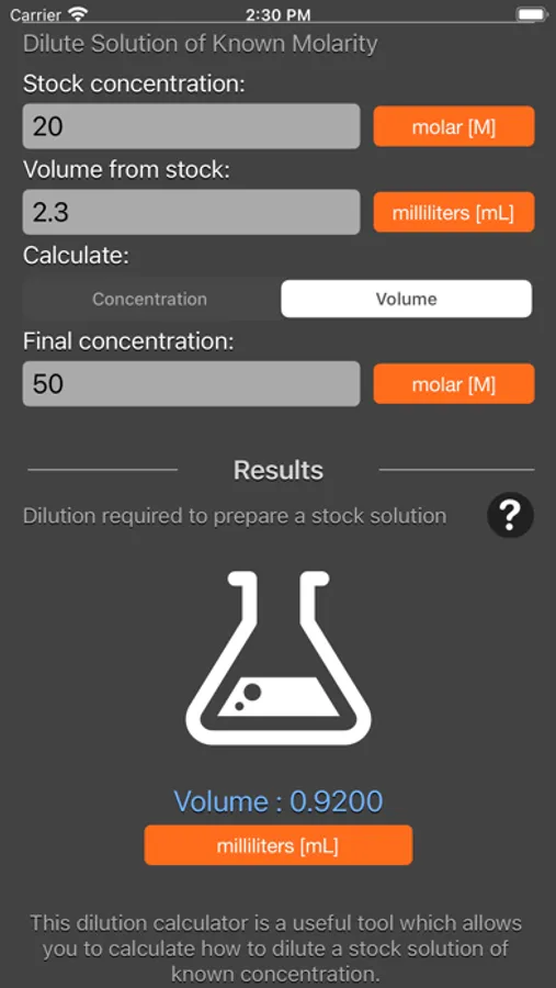 - Enter 20 into the Volume (final) box and select the correct unit (milliliter)