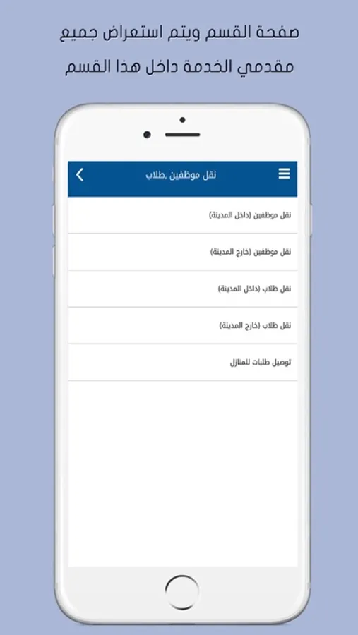 6 - اختيار القسم الرئيسي المطلوب الذي يريد طلب الخدمة منه ثم الدخول الى القسم الفرعي ستظهر له كافة الوسائل المتوفرة في هذا القسم وبعد الضغط على الوسيلة المطلوبة ستظهر صفحة تحتوي على مقدمي الخدمة لهذا القسم وعند الضغط على اسم مقدم الخدمة ستظهر صفحة به بيانات مقدم الخدمة بالكامل .