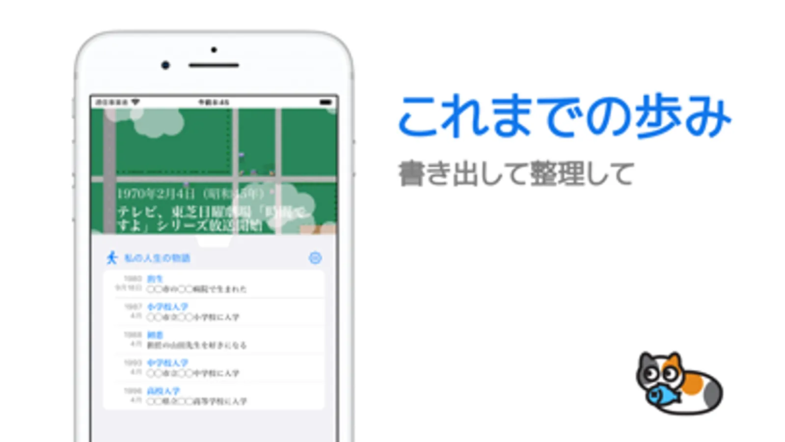 これまで頑張ってきた人生を一旦振り返って整理してみてはいかがでしょうか。個人的な出来事を年表にして記録できます。その時々の世の中の出来事と合わせてアニメーション表示でご覧になれます。