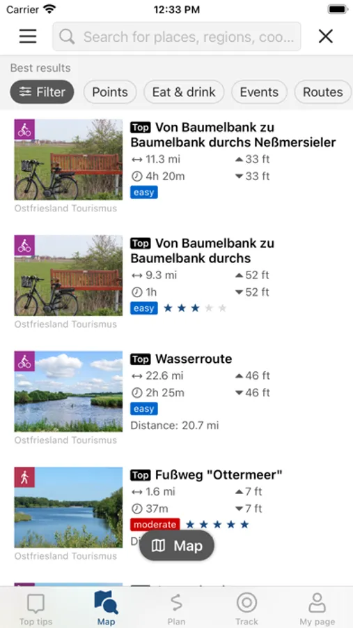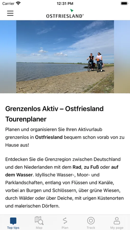The app "Grenzenlos Aktiv - Ostfriesland Tourenplaner" is your practical holiday planner - for planning in advance from home or directly on site. It not only has over 500 suggestions for hikes, cycling tours and canoe trips, but also a large selection of accommodation options. In addition, there are numerous valuable tips for excursion destinations such as mills, lighthouses, museums, spas or island excursions. With the Top Tips you get a first-hand compilation of the most beautiful tours.