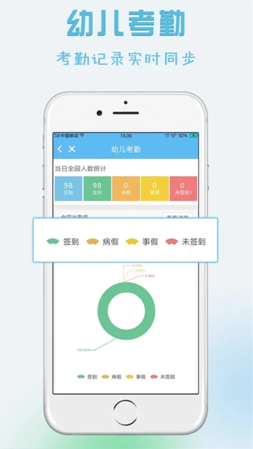 3、园内统计:统计全员、班级、年级不同时段的出勤数据,分析出勤情况及原因。