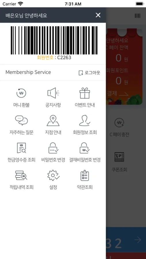 앱 설치 후 충전하여 바코드를 통해 결제할 수 있고,