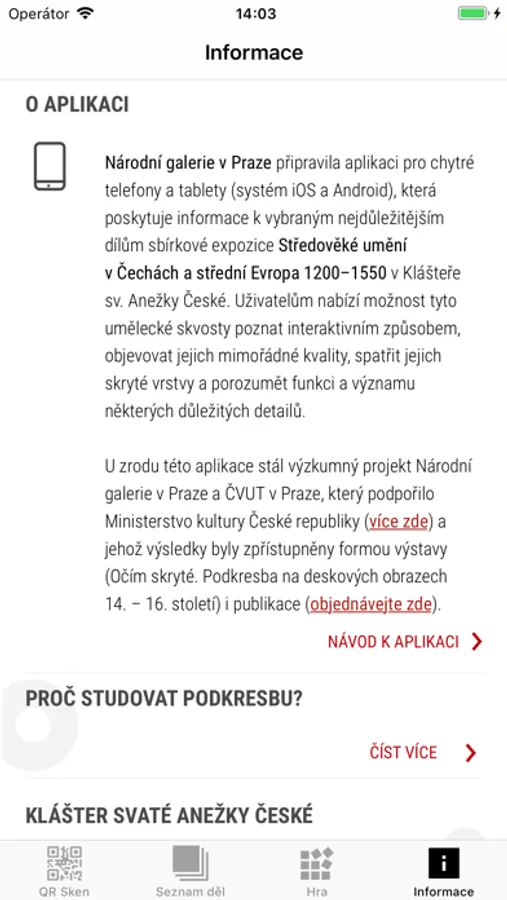 expozice Středověké umění v Čechách a střední Evropa 1200–1550 umístěné v prostorách Kláštera sv. Anežky České. Slovem a obrazem vám zprostředkuje zajímavé informace týkající se námětů, použitých technik, autorství a procesu tvorby obrazů, které patří k nejcennějším ve sbírkách Národní galerie v Praze. Množství reprodukcí nabídne pohled pod povrch malby, do skrytých vrstev, které nejsou pouhým okem viditelné, včetně podkresby, jež byla důležitou fází vzniku deskové malby a jež je mimořádně poutavým dokladem toho, jak tato díla byla vytvářena v dobových malířských dílnách. Uživatel může sám prozkoumat nejzajímavější detaily snímků podkreseb, s nimiž ve svých výzkumech pracovali odborníci Národní galerie. Aplikace však též přiblíží detaily konečné malby, které mnohdy dnešní divák nezaznamená, případně si neuvědomí jejich funkci a význam.
