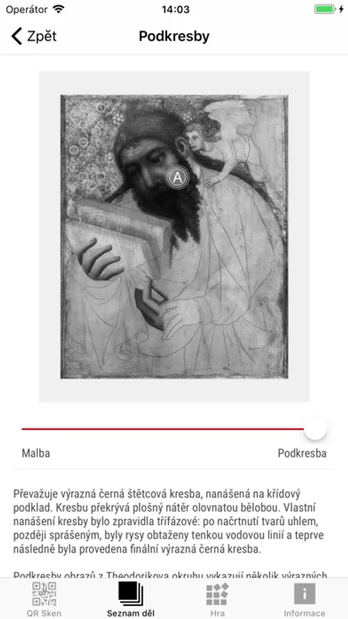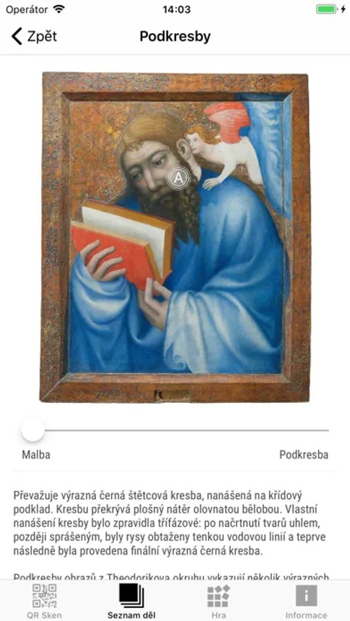 displayed in the collection of Medieval Art in Bohemia and Central Europe 1200–1550 that is located at Convent of St. Agnes of Bohemia. A number of pictures and comments will provide you with a lot of interesting information regarding the iconography and techniques of some key medieval panel paintings originating at the territory of the Czech lands. You will also learn about their authors and the process of their creation. IRR pictures will enable you to look into hidden layers of the artefacts that are not visible for the naked eye namely the underdrawing. The underdrawing represents a very important step in the process of creation of a given art work and tells us a lot about the interventions of all those who participated being members of medieval master's workshop. Everyone can examine some most interesting samples of the material that has been recently analysed by the researchers of the National Gallery. Moreover, the application will also show you (and comment upon) a large number of details that are visible but may escape the attention of viewers or are not so easy to understand nowadays.