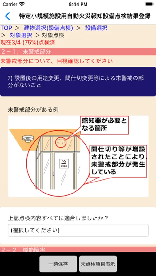・はじめに、建物情報や点検者情報、消防用設備等の情報を入力して初期登録します。次に、点検を実施する画面で、画面の案内に沿って消防用設備等の各点検項目をチェックしていきます。点検を完了すると、消防署等に提出する点検結果報告書をPDFで出力することができます。