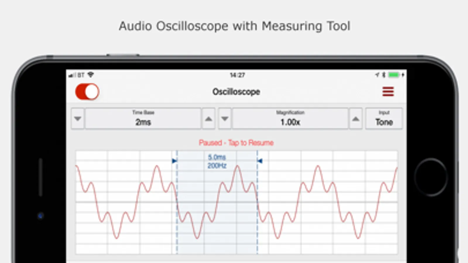 The Audio Oscilloscope allows you to analyse directly from the tone generator or microphone. The scope features both free running and single shot modes with adjustable triggering options. The single shot mode automatically starts and stops capturing when short bursts of sound exceed a threshold. The oscilloscope also features a simple measuring tool to help measure duration and frequency of a waveform.