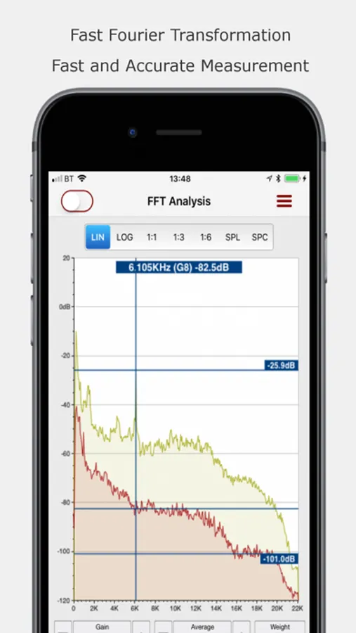 There are also specific modes to detect peak frequencies, musical notes with cents offset, perfect for instrument tuning. Definable calibration tuning allows you to tune +/- 40Hz.
