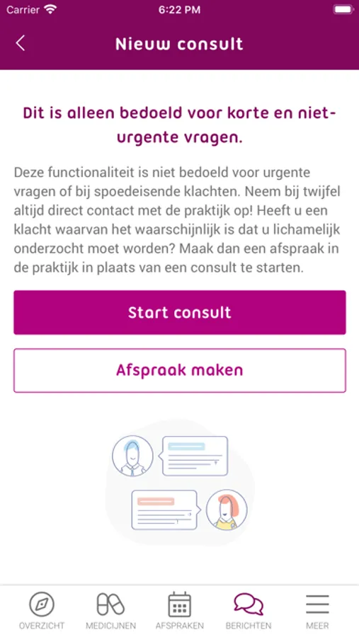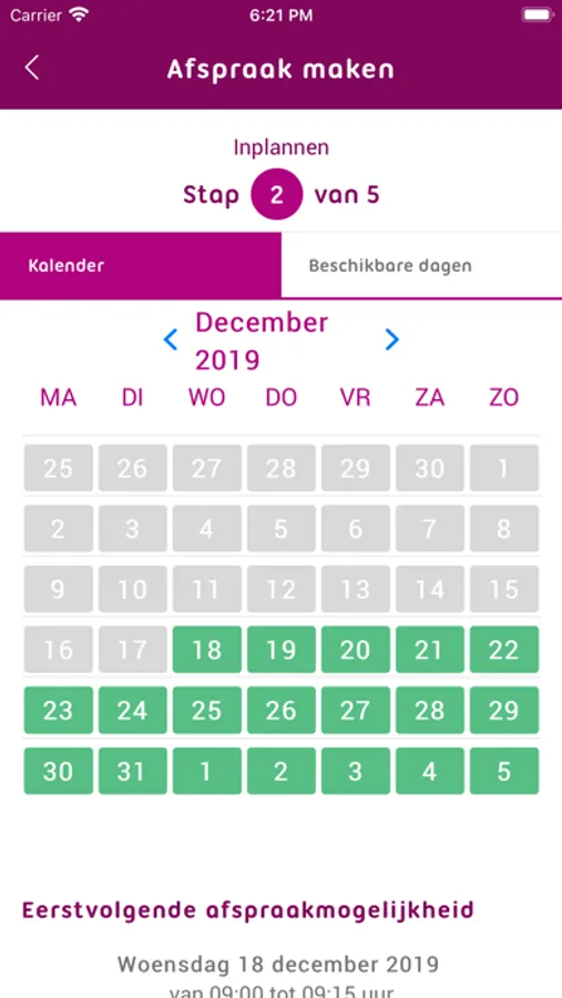 • Bekijk de lege plekken in de agenda van uw arts en boek een afspraak op het moment dat het u uitkomt. U moet tevens de reden van uw afspraak vermelden.