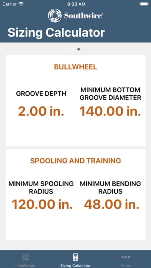 Calculator to determine the minimum diameter of the bullwheel and blocks needed for installation.