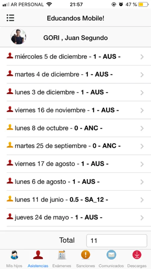 * Seguimiento de Asistencias: El tutor puede ver todas las inasistencias que tiene su hijo, pudiendo acceder al detalle de la inasistencia para el día seleccionado. Además es posible visualizar la cantidad de inasistencias acumuladas hasta la fecha. También, de forma opcional, permite recibir notificaciones de nuevas inasistencias.