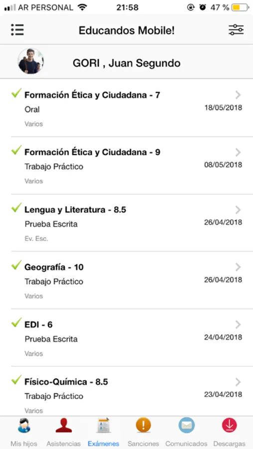* Seguimiento de Exámenes: Desde este módulo el tutor puede ver los exámenes de su hijo, tanto los programados que todavía no fueron evaluados, como los que ya fueron calificados. También puede acceder al detalle de un examen particular, visualizando día, materia, tema, tipo de examen, etc. Opcionalmente, permite recibir notificaciones de nuevos exámenes y/o calificaciones.
