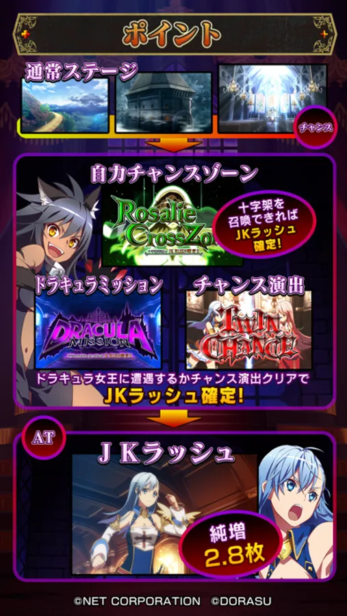 純増2.8枚のAT「JKラッシュ」を搭載し、新基準の高純増AT機では最高クラスの初当たり確率「1/296(設定1)」を実現!最高クラスの「純増スピード×初当たり確率」が生み出す、圧倒的な期待と興奮が味わえる究極バランススペックの誕生!!
