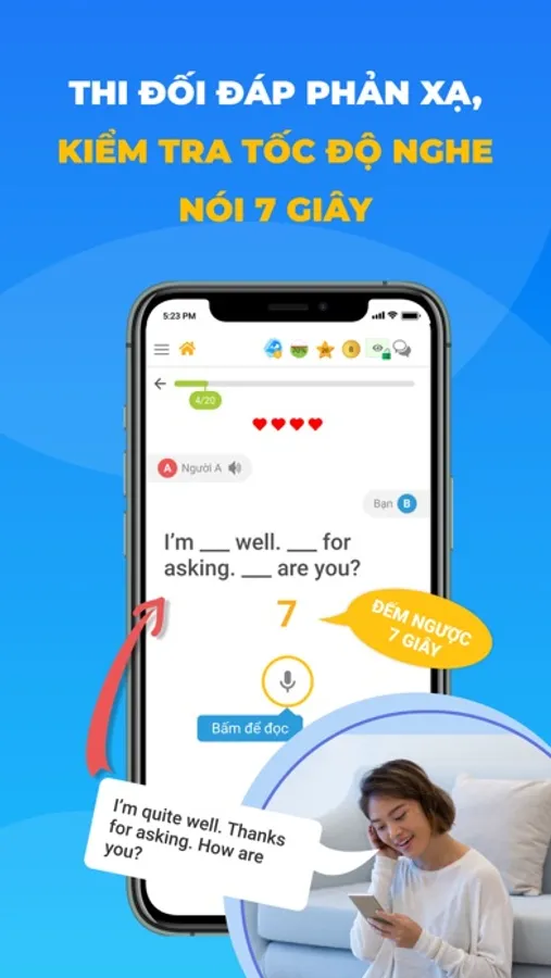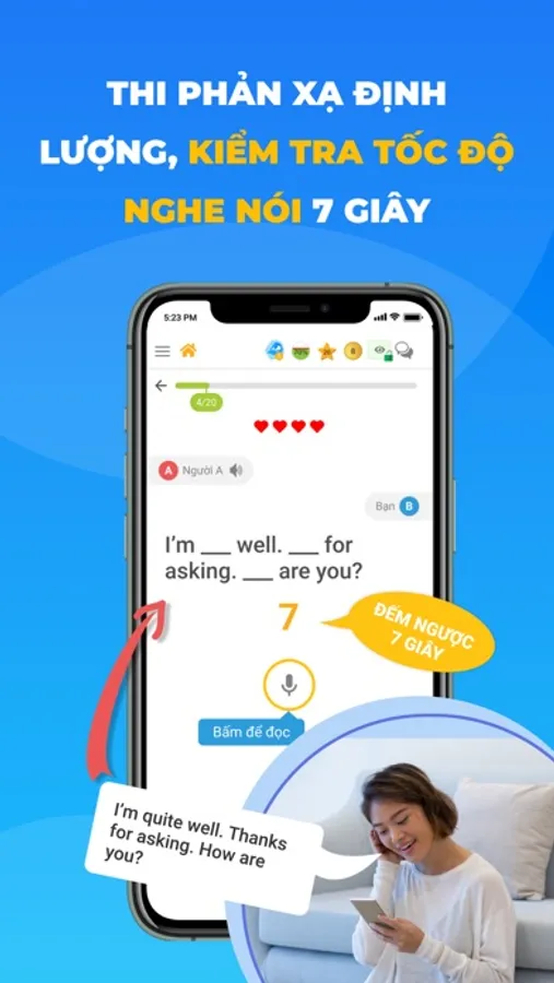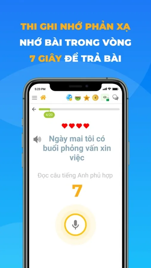-Công cụ thi phản xạ 7 giây nhằm đảm bảo bạn đạt khả năng nghe là nhận ra 25000 câu từ bên trên trong vòng 7 giây, muốn nói là nhớ ra để nói ngay trong vòng 7 giây