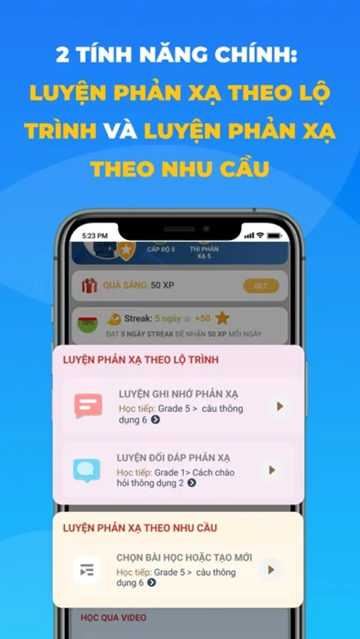 -Công cụ luyện phản xạ theo 2 phương pháp GHI NHỚ PHẢN XẠ và ĐỐI ĐÁP PHẢN XẠ, giúp đưa toàn bộ nội dung 3 loại vốn trên vào bộ nhớ dài hạn của bạn, đạt khả năng ngôn ngữ của một người bản xứ trưởng thành (chứ không phải của trẻ em)