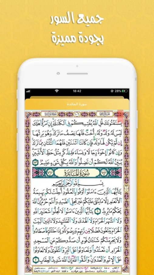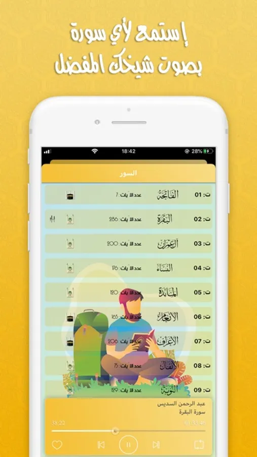 ◉ Advanced audio options to help with memorization (repetition of ayah, Surah, number of repetitions, interval, and recitation speed), Bookmarking of surah, page