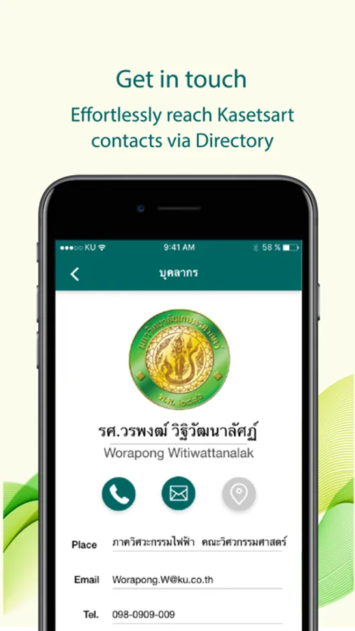• การแสดงข้อมูลทั่วไปของมหาวิทยาลัย ผู้ขอใช้บริการสามารถค้นหาข้อมูลที่เกี่ยวข้องกับมหาวิทยาลัย เช่น รายชื่อบุคลากร คณะ ภาควิชา หน่วยงาน หมายเลขโทรศัพท์ เป็นต้น