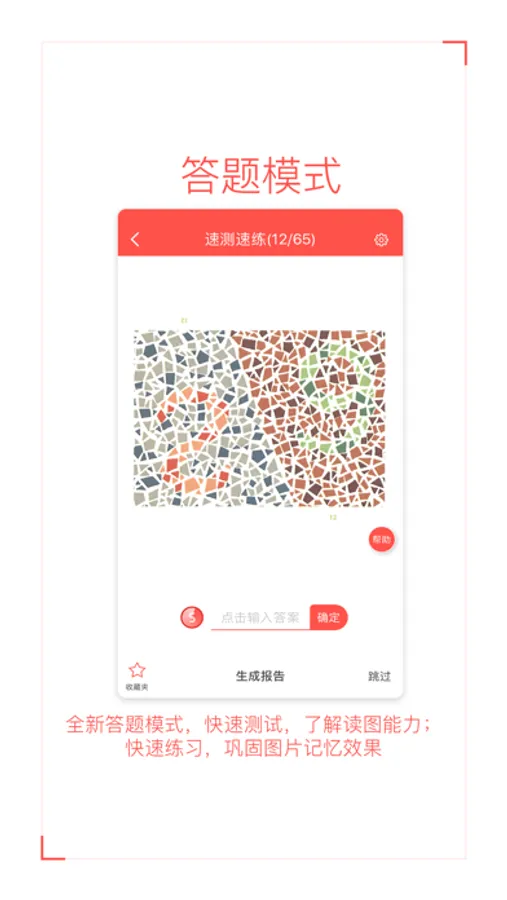 1,测试模式。从第五套图谱中随机从题库选取,测试辨色能力,测试结果中包含答案分析,结果更有对比性。