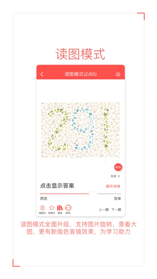 3,读图模式。选取特定图谱,按顺序浏览图谱和答案。通过色盲滤镜还原图谱真相。