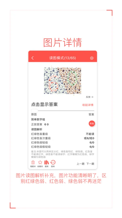 色盲自测包含了常用的几套色盲测试图,还有很多方便的功能,如以下几项,辅助学习,希望能对您的体检有所帮助。