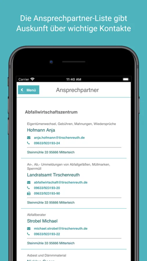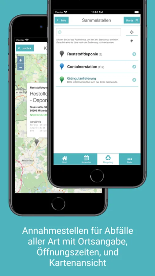 * Annahmestellen für Abfälle aller Art mit Ortsangabe und Öffnungszeiten, inkl. Kartenansicht und Navigation.