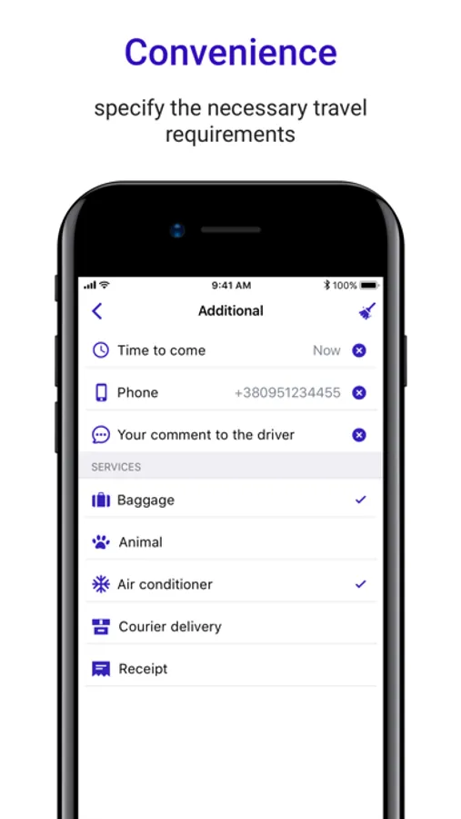 - выбор дополнительных услуг по заказу - возможность указать необходимые для поездки условия, например, перевозка животного