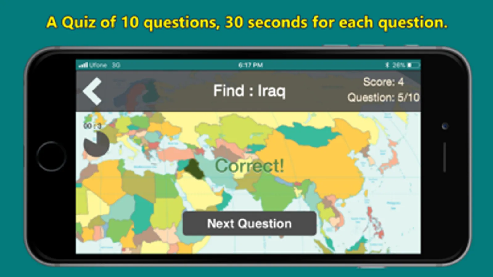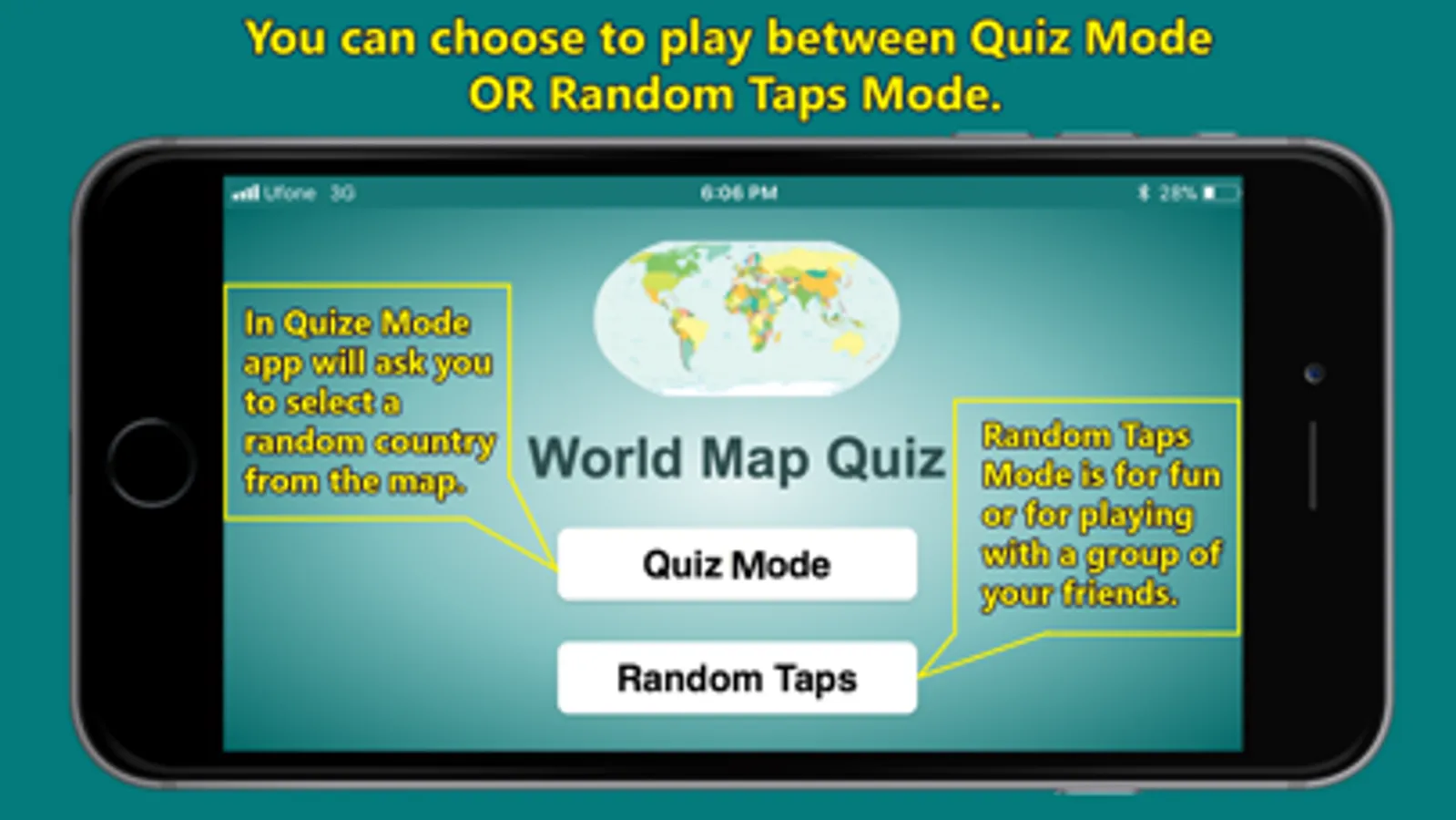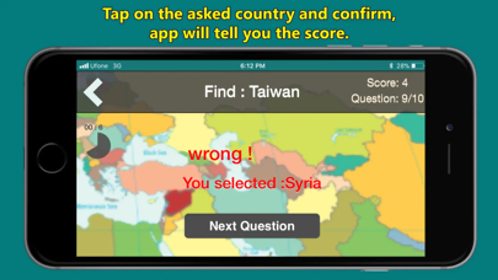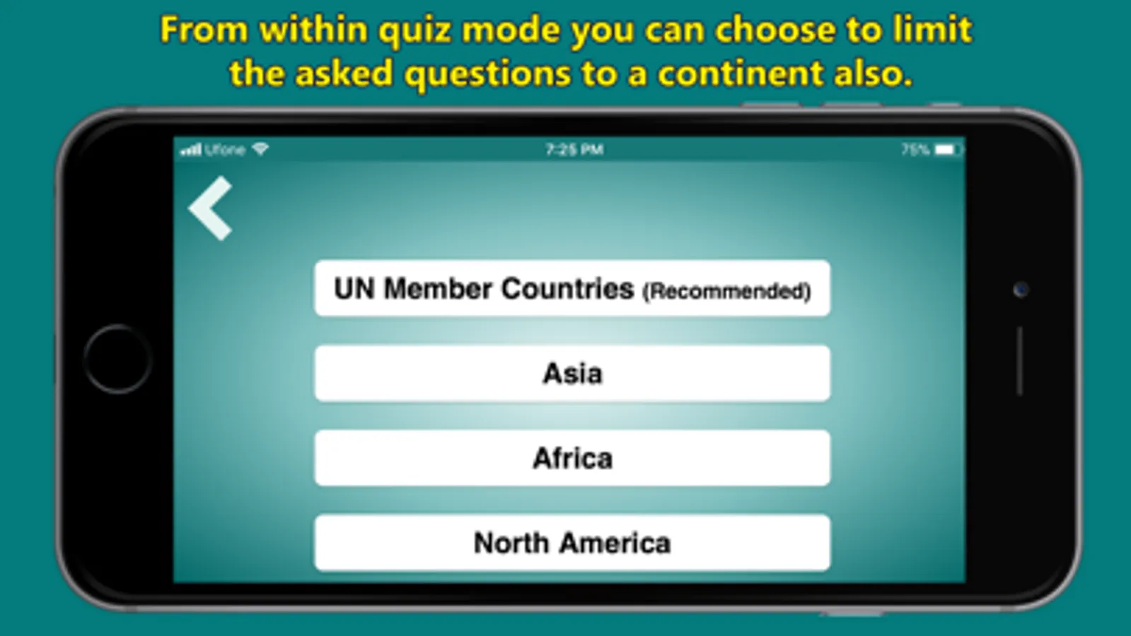 Quiz mode is based on 10 questions for each session, user is asked to select a random country on the world map. Quiz mode can further be played for continents, UN Member Nations and the whole world.